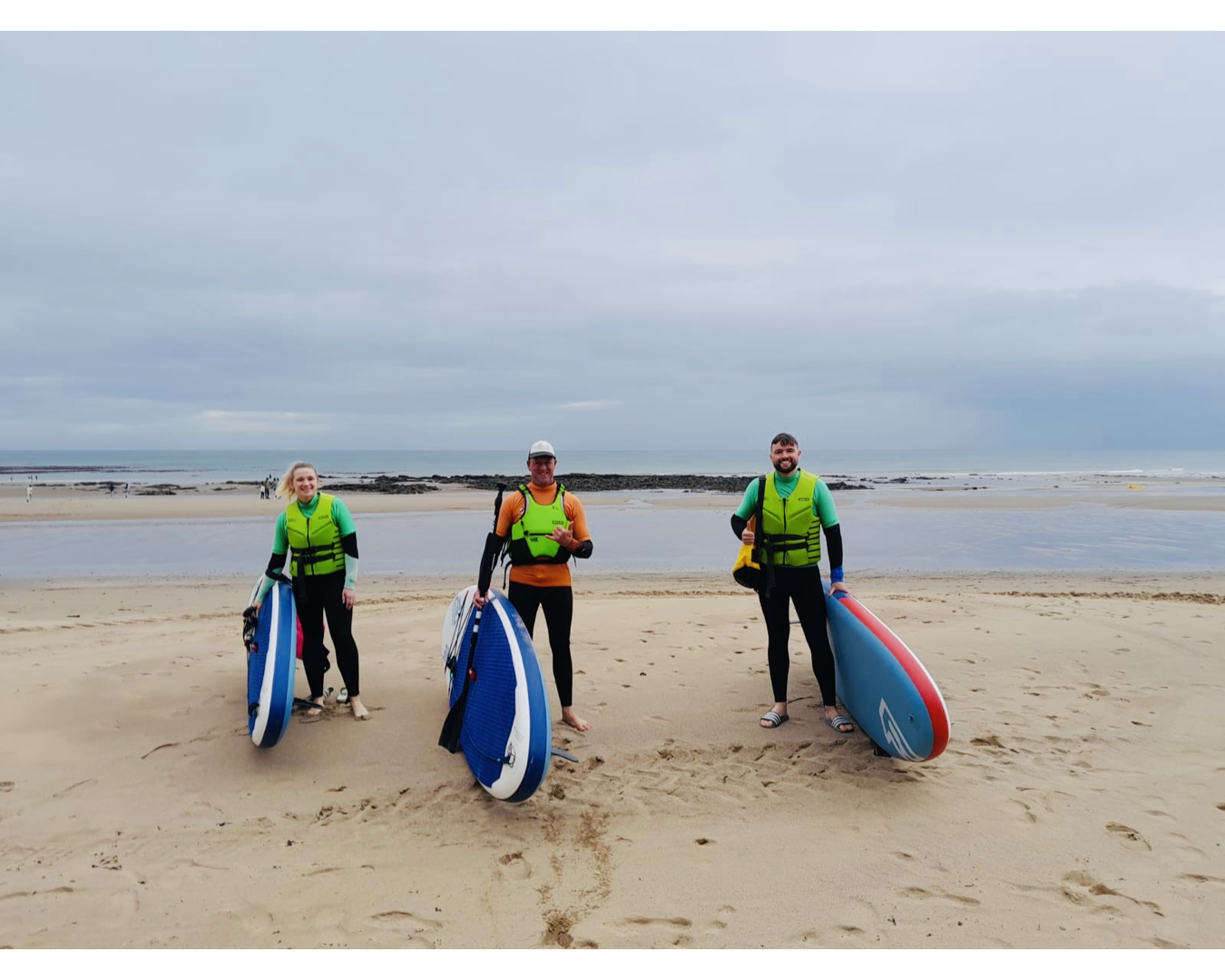 We provide everything required to participate in the lesson. Inflatable SUP, wetsuit, safety equipment, lockers, toilets, and changing facilities – located at the shop. Lessons are 1.5 hours long so please bring a drink, sun cream and a hat for those hot days!